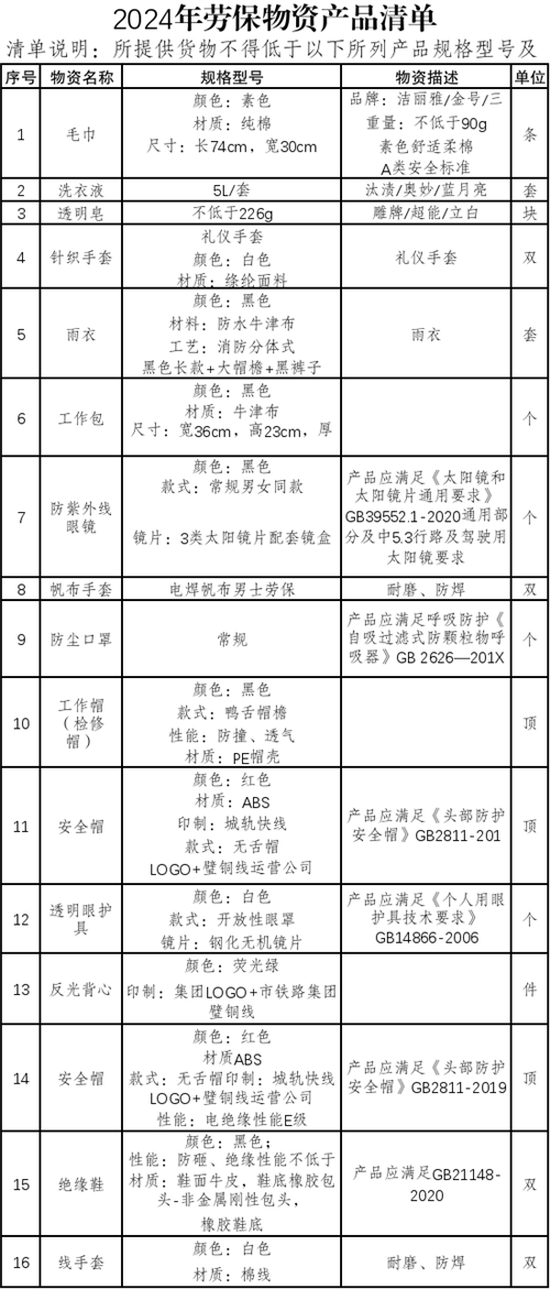 根據(jù)璧銅線運營公司工作開展需要,擬采購公司2024年勞保用品,包含但不限于針織手套、線手套、帆布手套、防紫外線眼鏡、安全帽、反光背心、絕緣鞋、工作帽(檢修帽)、透明眼護具、雨衣、防塵口罩、毛巾、洗衣液、透明皂等日常運營勞保防護所必須配置物品,并完成驗收工作。