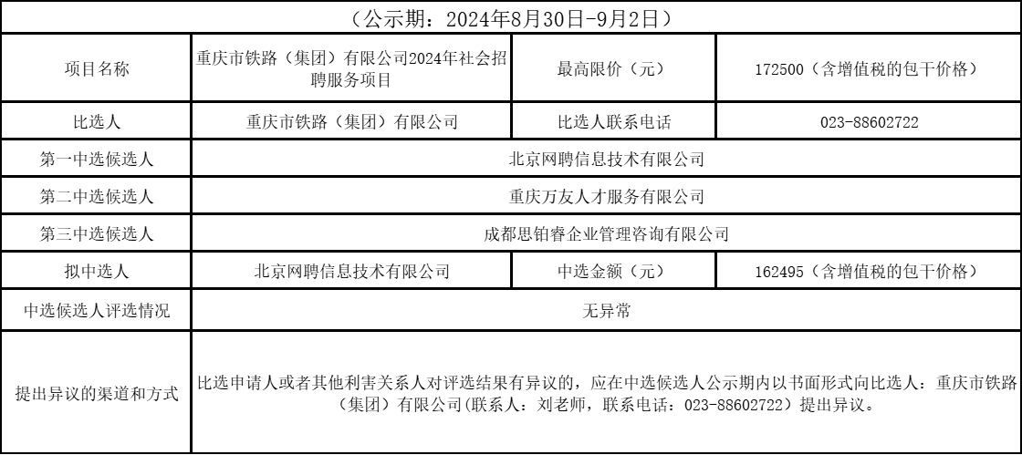 重慶市鐵路(集團(tuán))有限公司2024年社會(huì)招聘服務(wù)項(xiàng)目競爭性比選結(jié)果公示表