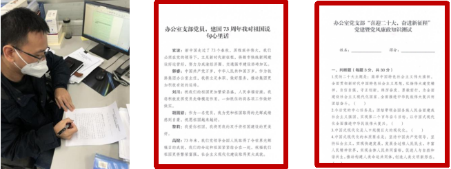 活動(dòng)簡介:為與時(shí)俱進(jìn)深入學(xué)習(xí)貫徹黨的二十大精神,用黨的創(chuàng)新理論武裝黨員干部頭腦、指導(dǎo)工作實(shí)踐,10月24日,辦公室黨支部開展了“學(xué)習(xí)貫徹黨的二十大精神,推動(dòng)辦公室工作創(chuàng)一流業(yè)績”主題黨日活動(dòng)。活動(dòng)中,再次學(xué)習(xí)了黨的二十大報(bào)告、習(xí)近平總書記近期重要講話精神,討論了黨費(fèi)收繳、意識(shí)形態(tài)工作、廉政建設(shè)、入黨積極分子培訓(xùn)等事項(xiàng),開展了“建國73周年,我對(duì)祖國說句心里話”活動(dòng)和“喜迎二十大,奮進(jìn)新征程”黨建暨黨風(fēng)廉政建設(shè)知識(shí)測試。