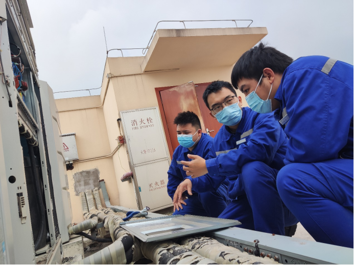 產(chǎn)業(yè)公司江跳線維管項目部車輛段機(jī)電工班工班長、團(tuán)員青年彭成正在教工班人員空調(diào)多聯(lián)機(jī)故障處置