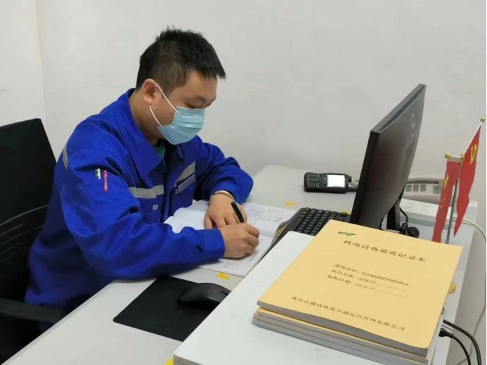 產(chǎn)業(yè)公司江跳線維管項目部九龍園機(jī)電工班組長、團(tuán)員青年陳俊男正在填寫值班當(dāng)日機(jī)電設(shè)備巡檢記錄