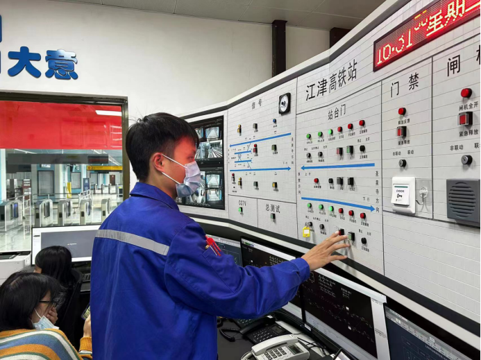 產(chǎn)業(yè)公司江跳線維管項目九龍園機(jī)電工班機(jī)電綜合檢修工、團(tuán)員青年葛志翔正在檢查江津高鐵站ABP盤站臺門控制功能
