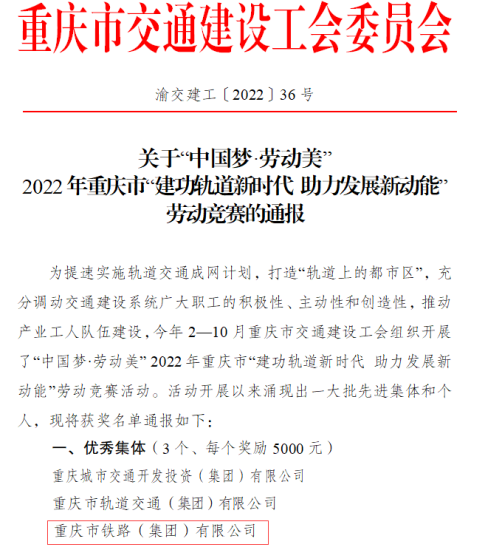 近日,重慶市交通建設(shè)工會對“建功軌道新時代 助力發(fā)展新動能”勞動競賽的優(yōu)秀集體、班組和個人進(jìn)行了表彰,市鐵路集團(tuán)榮獲“優(yōu)秀集體”,城軌快線15號線項目部、27號線項目部獲“優(yōu)秀班組”,6人分別獲得“優(yōu)秀個人”“優(yōu)秀組織獎(個人)”。