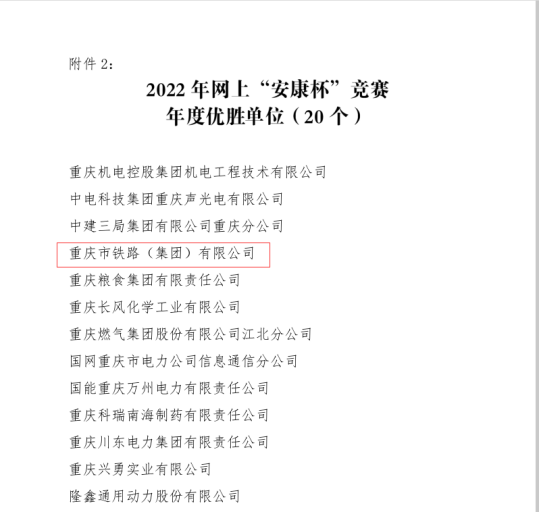 此前,在重慶市總工會“建功‘十四五’奮進(jìn)新征程”網(wǎng)上勞動和技能競賽中,市鐵路集團(tuán)高度重視、精心部署,在抓好疫情防控的同時,結(jié)合企業(yè)生產(chǎn)經(jīng)營目標(biāo)任務(wù),強(qiáng)化統(tǒng)籌協(xié)調(diào)和現(xiàn)場組織,在落實企業(yè)主體責(zé)任、深化安全生產(chǎn)和職業(yè)健康活動、加強(qiáng)勞動保護(hù)和安全管理、增強(qiáng)安全意識和技能等方面下功夫,全面立體展示市鐵路集團(tuán)組織參與勞動和技能競賽活動的實施舉措和實際成效。市鐵路集團(tuán)榮獲“安康杯”競賽年度優(yōu)勝單位,15名職工獲得“月度之星”,2名職工獲得“季度之星”,1個“五小活動”項目獲得“小革新”獎。